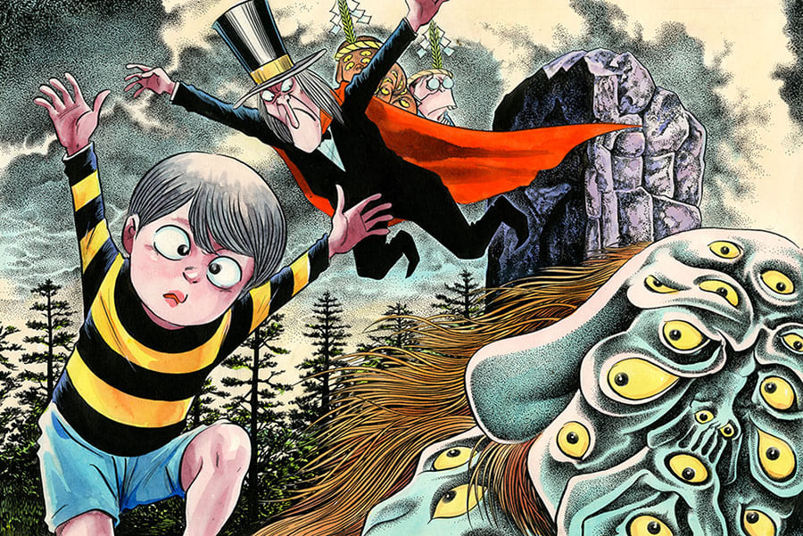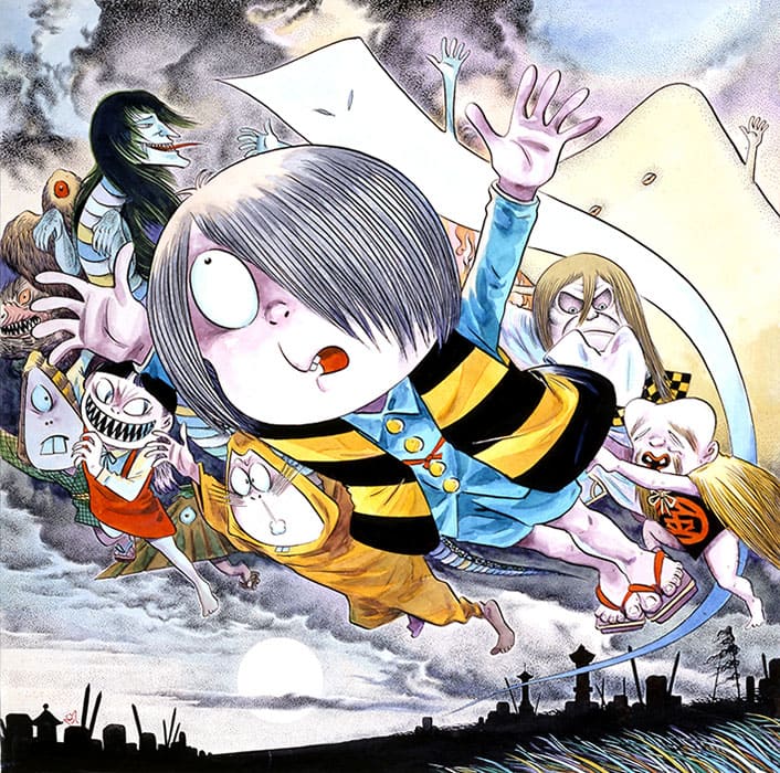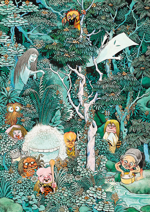『ゲゲゲの鬼太郎』などで知られる日本漫画界の鬼才 水木しげる(本名 武良 茂)は、鳥取県境港で過ごした少年時代に見た正福寺所蔵の「地獄極楽絵図」に心を奪われて以来、目に見えない世界を信じるようになり、生涯にわたって不思議な世界を表現し続けました。