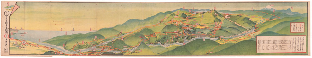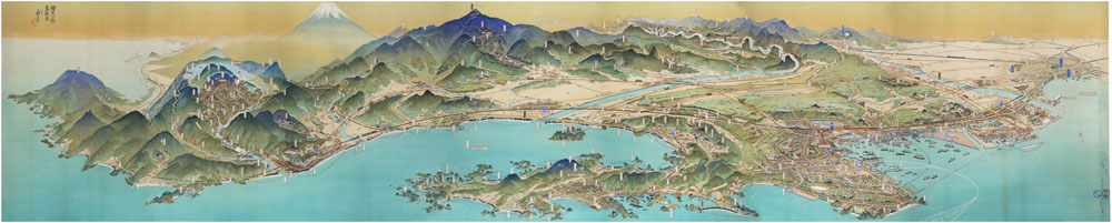 吉田初三郎・作「神奈川県鳥瞰図」など大正から昭和初期に描かれた鳥瞰図は、外観を挿し絵で表現した名所旧跡などを紹介するだけでなく、立体的に表現された地形が見どころとなっています。これらが生み出された時代背景を人文科学的、地形表現を自然科学的なアプローチで迫ります。