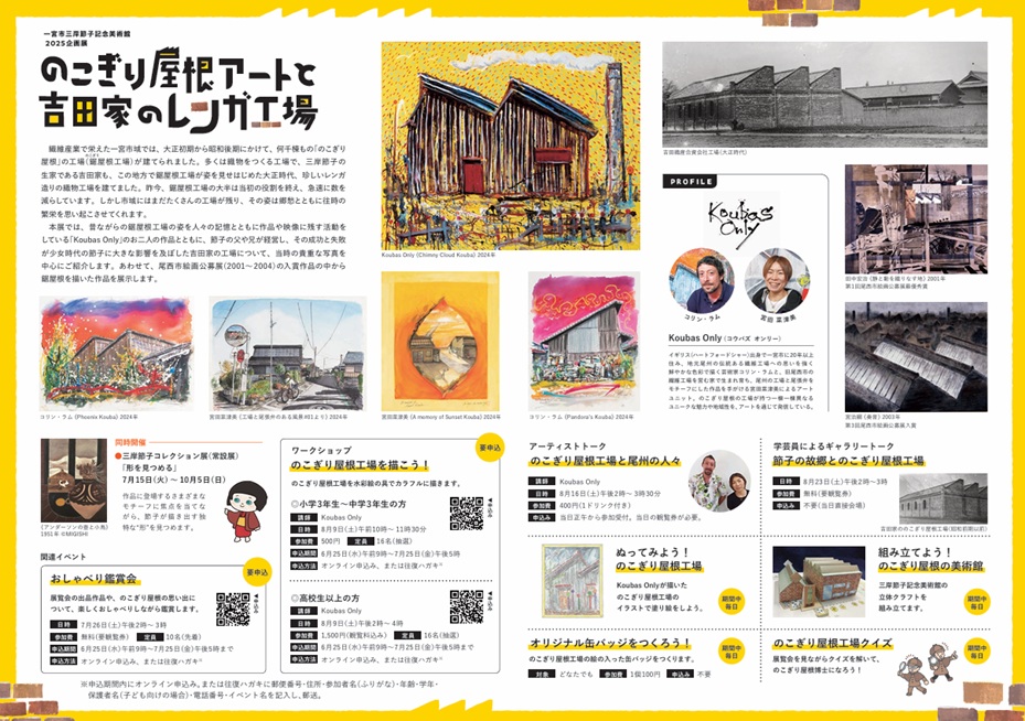 本展では、昔ながらの鋸屋根工場の姿を人々の記憶とともに作品や映像に残す活動をしている「Koubas Only」のお二人の作品とともに、節子の父や兄が経営し、その成功と失敗が少女時代の節子に大きな影響を及ぼした吉田家の工場について、当時の貴重な写真を中心にご紹介します。あわせて、尾西市絵画公募展(2001~2004)の入賞作品の中から鋸屋根を描いた作品を展示します。