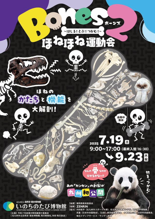 動物の体を支え、動かす「骨」のさまざまな形や役割について、骨格標本や剥製の展示を通してご紹介します。走ったり、とんだり、つかんだりと運動会のように体を動かす様々な動物たちの骨を触ったり、私たちヒトの骨と比べたりして体感してみましょう。九州初公開となるジャイアントパンダ(カンカン)の剥製が登場して、竹をつかむことのできるパンダの手の不思議を紹介します。そして、硬い骨が化石となったからこそ古代の生態が明らかになった、肉食恐竜デイノニクスが草食恐竜テノントサウルスを襲うシーンを再現した骨格標本など、貴重な標本が盛りだくさんです。