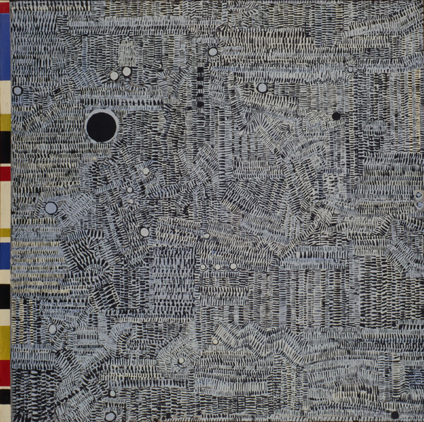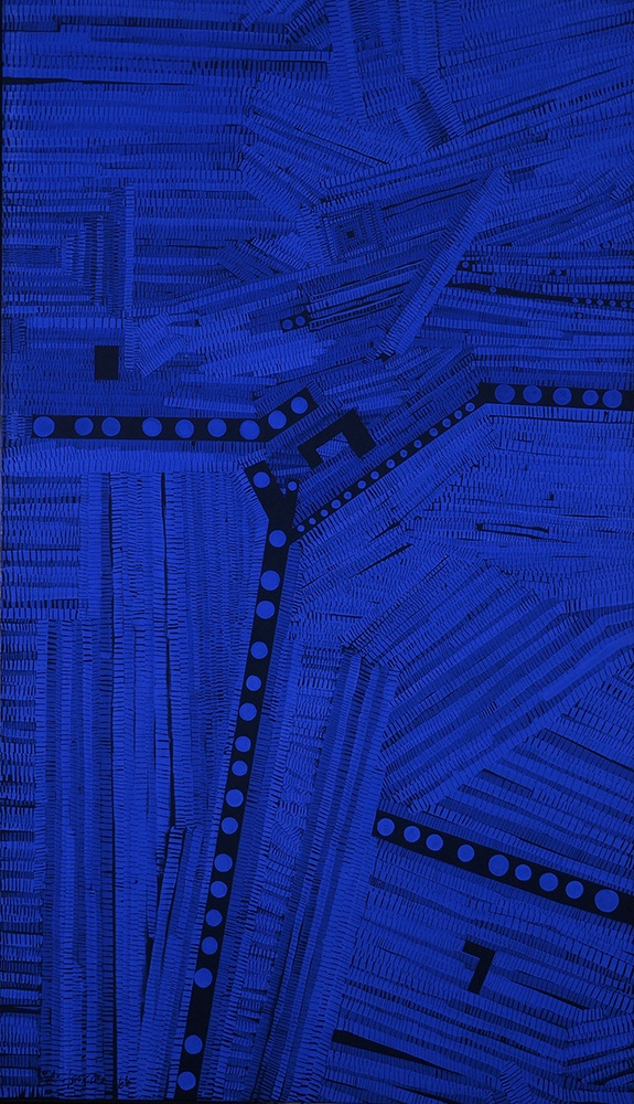 1960年代になると、猪熊はニューヨークという都市の喧騒と秩序を描くことへの関心を高めます。油絵具の質感を生かしつつも、画面の凸凹は抑え、代わりに画面全体を細かい線描で埋め尽くした絵画を描くようになります。この頃、アメリカでは抽象表現主義やポップアートの画家たちが、当時まだ新しい画材であったアクリル絵具を用いた大画面の表現を試みていました。猪熊も1964年頃より、乾きが早く、フラットな表現を可能とするアクリル絵具を用いて、自身の表現の幅を広げていきます。都市をテーマにした絵画は、直線や幾何学的な図形を組み合わせたシャープな構成へと変化していき、1970年には余白の部分と細かい描き込みの部分が独自のバランスにおいて共存する、整然たるコンポジションが結実しました。