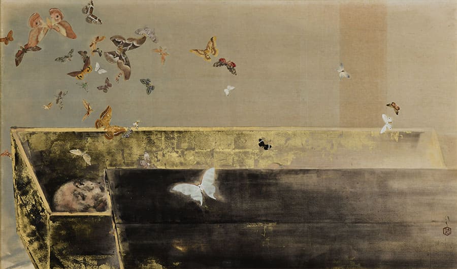 明治・大正・昭和という激動の時代を生き、「会場芸術」を掲げて圧倒的なスケールで超大作を生み出した日本画家・川端龍子(かわばたりゅうし 1885-1966)。龍子は和歌山県に生まれ、上京して洋画家としてその画業を始めます。後に渡米し、ボストン美術館で見た日本の古美術に感銘を受け、1914(大正3)年に日本画に転向。その後、再興日本美術院展を舞台に、洋画の手法を取り入れつつ、次第に作品の巨大化を試みます。日本画の枠にとらわれない個性豊かな作品は、院展で異彩を放ちましたが、1928(昭和3)年に同院を脱退。翌年に、在野の日本画団体「青龍社(せいりゅうしゃ)」を自ら主宰し、そこから30年以上にわたって画壇をリードしていきます。龍子は、青龍社で「会場芸術」を掲げ、時代性を意識したテーマを圧倒的なスケールで描き出し、人々をあっと驚かせ、それまでの「床の間芸術」とは異なる新しい日本画のスタイルを確立させました。