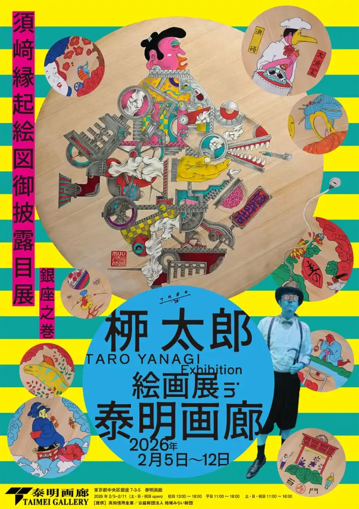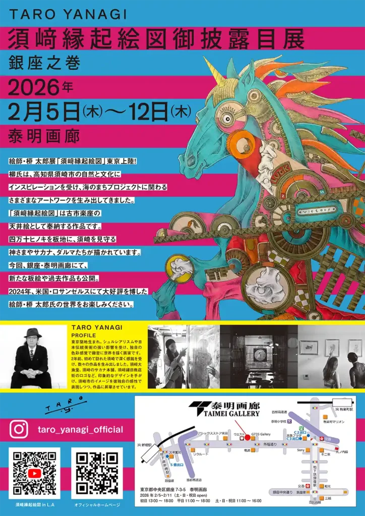 本展は 絵師 桺太郎による須﨑縁起絵図を中心とした絵画展である。高知県須崎市の自然 文化 信仰を背景に制作された須﨑縁起絵図は 四万十ヒノキの板地に 神さま サカナ ダルマなどが描かれ 須崎の土地を見守る物語世界を形成している。もともと古市楽座の天井絵として奉納される作品であり 本展ではその御披露目として 新作の板絵や過去作品もあわせて展示される。須崎というローカルな土地性と 現代的な絵師表現が結びついた 桺太郎独自の世界観を銀座の画廊空間で体感する機会となっている。