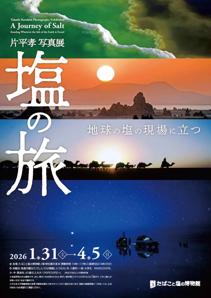 写真家・片平孝が1970年代初頭より生涯をかけて取り組んだ「塩の旅」を総覧する写真展。アフリカを起点に、世界各地の塩湖、塩原、岩塩坑、天日塩田などを訪ね歩き、塩が生み出す地球規模の造形と、人類の生活に不可欠な存在としての塩を記録してきた。本展では、世界の「塩の現場」で撮影された写真作品約80点を8つの章で構成し、多様で壮大な地球の姿を紹介する。あわせて、大判フィルムカメラやデジタルカメラ、旅に用いた装備などの資料も展示し、片平孝の写真家としての歩みと方法論にも迫る内容となっている。