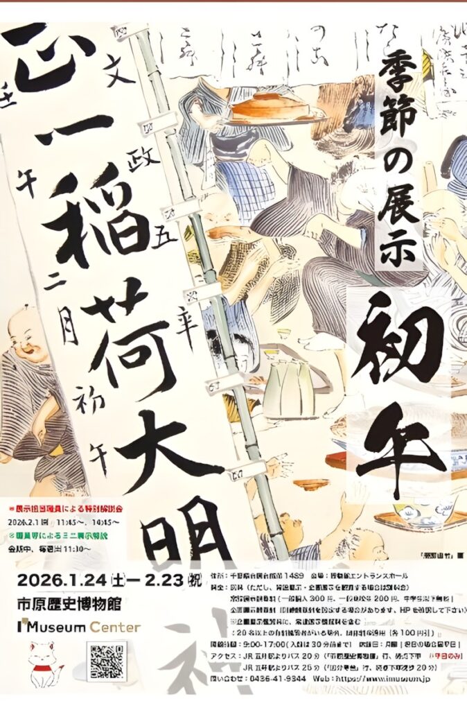本展示は、日本の年中行事のひとつである「初午」をテーマとした季節展示である。初午は稲荷信仰と深く結びつき、五穀豊穣や商売繁盛を願う民間信仰として各地に根付いてきた。本展では、市原地域における初午の風習や信仰のあり方を、通史展示と連動させながら紹介し、暦と民俗行事が人々の生活文化の中で果たしてきた役割を読み解く。展示解説会や学芸員によるミュージアムトークを通じて、季節行事の意味をより立体的に理解する機会を提供する。