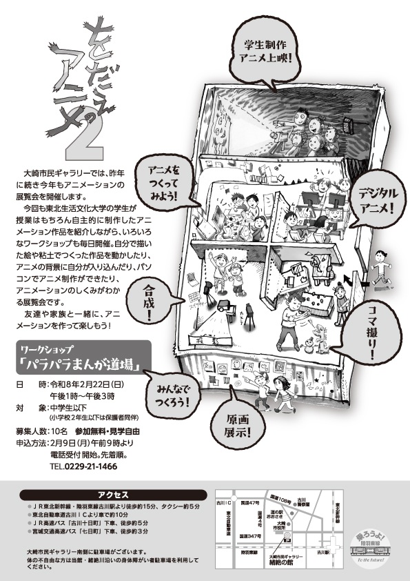 本展は、大崎市と東北生活文化大学による連携協力事業として開催されるアニメーション展覧会である。大学の授業内制作作品に加え、学生が自主的に制作したアニメーション作品を紹介しながら、会期中は毎日ワークショップを実施する。描いた絵や粘土作品を動かす体験、アニメーションの背景に入り込む演出、パソコンを用いた制作体験などを通じて、アニメーションの仕組みを身体的に理解できる構成となっている。鑑賞と制作体験を横断することで、アニメーションを表現文化としてだけでなく、身近な創造行為として捉え直すことを目的とした展覧会である。