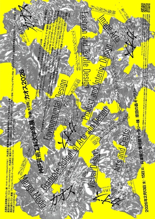 本展は、神戸芸術工科大学の学部生および大学院生による卒業研究 修了研究の成果を発表する総合的な卒業制作展である。芸術と工学の融合を理念とする同大学の教育研究の集大成として、約400名の学生による多様な実践が一堂に会する。展示は、作品発表にとどまらず、映像 映画上映、ファッションプレゼンテーション、選抜研究発表会など複数の形式を横断しながら構成され、現代社会が抱える課題を芸術工学の視点から問い直す試みが展開される。カオス2026というタイトルが示す通り、分野や方法論の交錯そのものが展示空間を形成し、次世代のアーティスト デザイナー クリエイターによる新たな価値の萌芽を可視化する場となっている。
