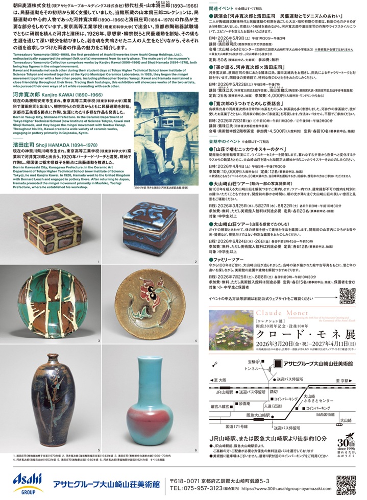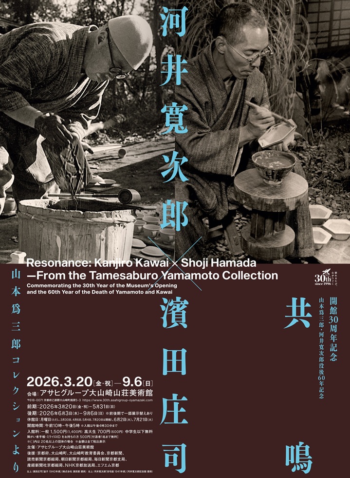 本展は、アサヒグループ大山崎山荘美術館の開館30周年と、河井寬次郎没後60年を記念して開催される展覧会である。朝日麦酒株式会社初代社長であり、民藝運動を初期から支援した山本爲三郎の蒐集によるコレクションを軸に、民藝運動の中心人物であった河井寬次郎と濱田庄司の作品を紹介する。東京高等工業学校および京都市陶磁器試験場で研鑽を積み、思想家柳宗悦とともに民藝運動を創始した二人は、生涯にわたり深い交友関係を結びながら、それぞれ異なる造形的探究を続けた。本展では、若き日に共鳴した思想と精神を起点に、両者が各自の道を切り拓いていった軌跡と、その作品に宿る魅力をあらためて浮かび上がらせる。