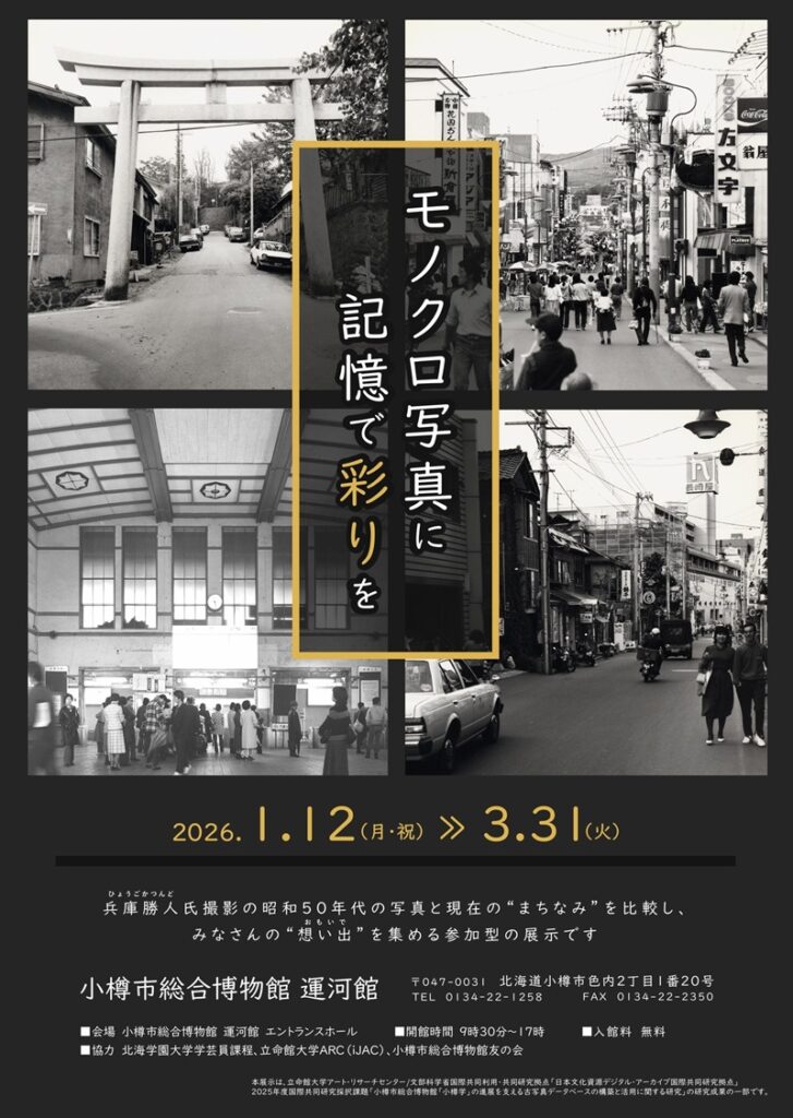 概要:本展は昭和50年代の小樽のまちなみを写した兵庫勝人によるモノクロ写真と現在の風景を対比し来館者それぞれの記憶や思い出を重ね合わせて完成させる参加型展示である。写真という記録媒体に個人の記憶を加えることで都市の時間的層を可視化し小樽の街が積み重ねてきた生活と風景の変遷を共有する場を創出する。展示は誰でも自由に参加でき記憶の書き込みや語りを通して写真に新たな彩りを与える試みとなっている。