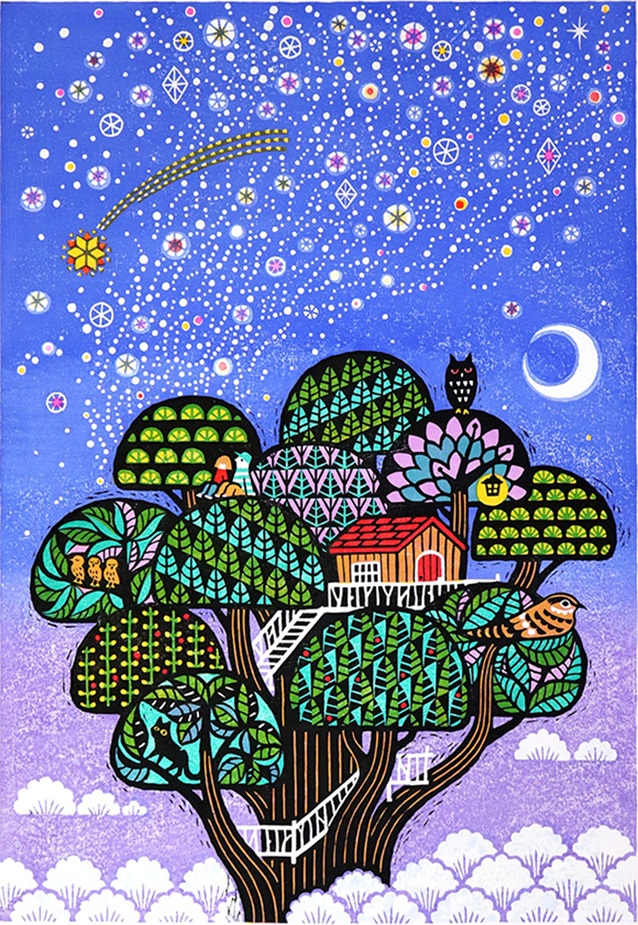 山登りや里山暮らしの中で出会った風景や動植物を日本の伝統的な多色摺木版画で表現する久木 朋子。