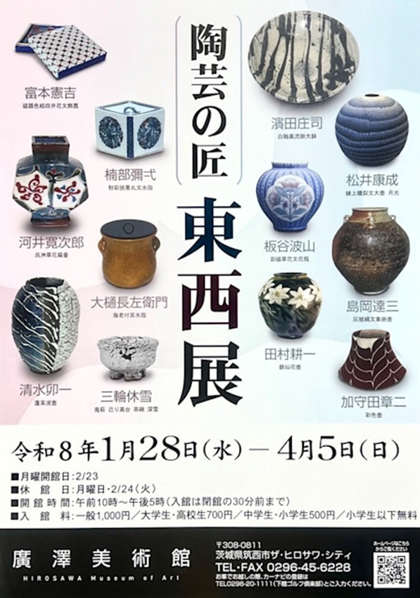 本展は日本各地で活躍する陶芸家の作品を通して東西それぞれの陶芸表現と技の多様性を紹介する展覧会である。土と火に向き合う制作姿勢や地域ごとに培われてきた造形感覚は器のかたちや釉調肌合いに明確な差異として現れる。本展では伝統的技法を基盤としながらも独自の表現を切り拓いてきた陶芸の匠たちの作品を一堂に集め日本陶芸の奥行きと広がりを提示する。
