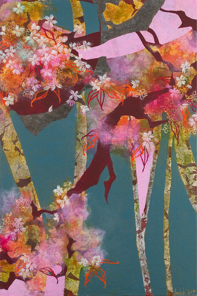 本展は日本画家岩﨑知子による個展であり生家の庭という私的かつ思索的な空間を主題に据えた絵画作品を紹介する。改築によって失われゆく庭の風景とそこに生きる植物の記憶は画家にとって時間と存在の重なりを映す場であり柿八重桜泰山木など身近な樹木は生命の循環と別れの感情を象徴する。生誕を祝して植えられた八重桜は大画面の中で永遠の花として結実し一方で残された泰山木は白い花を咲かせ生の意志を強く主張する。八木重吉の詩句に響き合いながら失われた花とこれから咲く花を双手で受け止めるように描かれた作品群は色彩と線が交錯する画面構造の中で静かな共鳴を奏でる。和と洋伝統と現代を往還する制作を通して作家としての成熟と現在地を示す展覧会である。