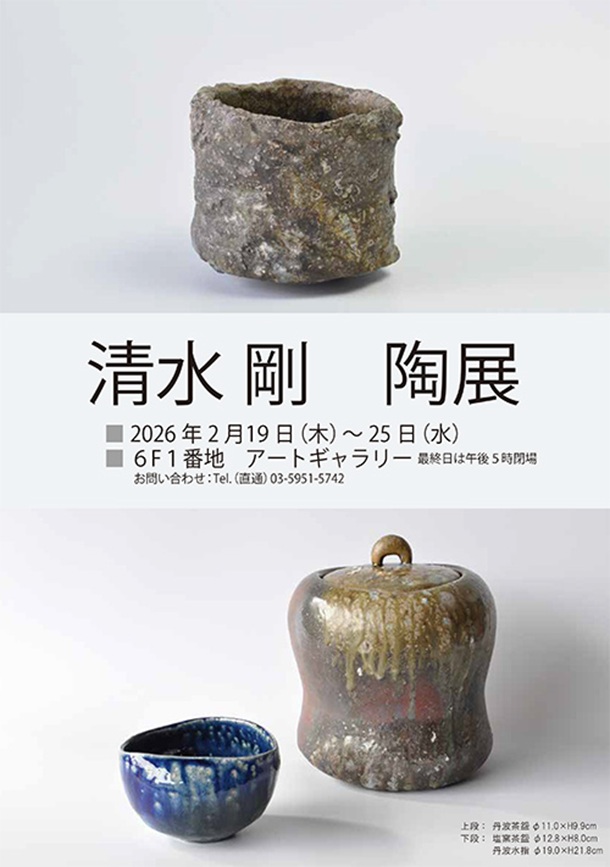 本展は 東武百貨店池袋店 アートギャラリーにて開催される 清水剛 による陶芸個展である。兵庫県丹波立杭を拠点に 日本六古窯のひとつである丹波焼の伝統を受け継ぎながら 薪窯による焼成を通して 現代的な造形と質感を追求してきた作家の仕事を紹介する。