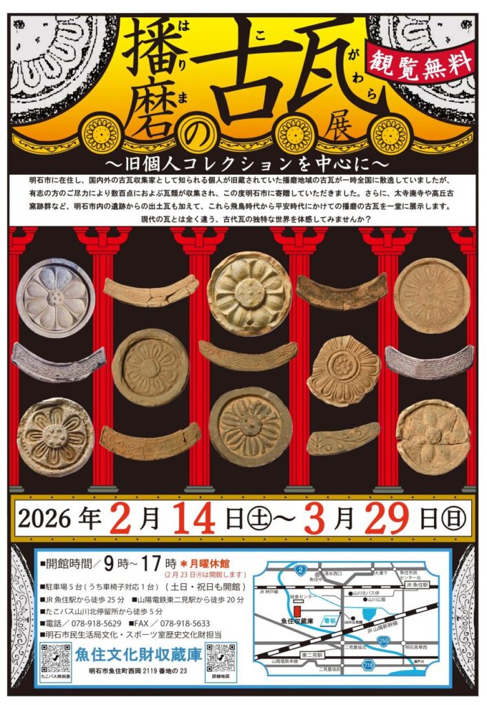 本展では それら寄贈資料に加え 太寺廃寺や高丘古窯跡群など 明石市内の遺跡から出土した瓦を展示し 播磨における古代瓦生産の実態と造形的特徴を多角的に紹介する。現代の瓦とは大きく異なる 文様や形態 技法をもつ古瓦を通して 古代の宗教 建築 技術 そして地域文化の広がりを体感できる構成となっている。