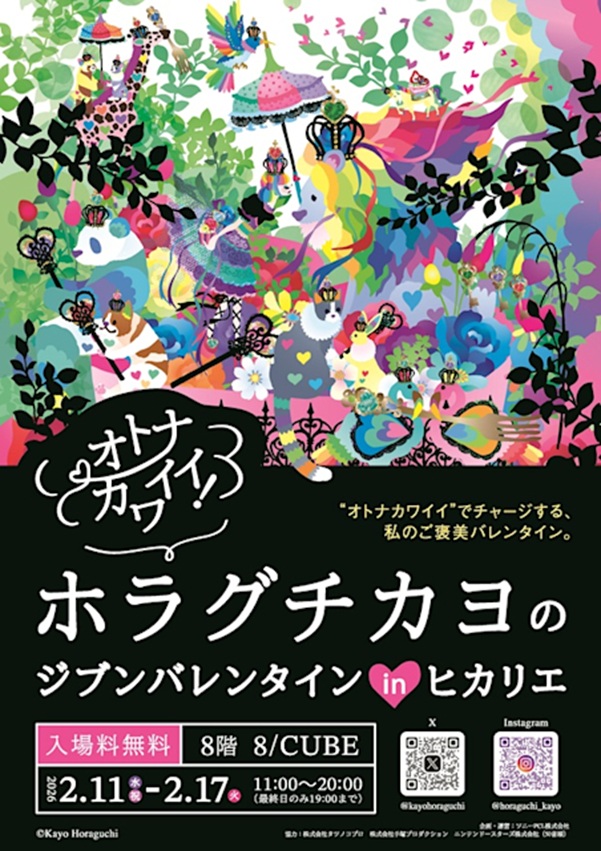 グラフィックアーティスト ホラグチカヨによる初の個展イベントとして開催される本展は バレンタインシーズンにあわせて 「オトナカワイイ」をテーマに構成された体験型展示である。鮮やかな色彩と幸福感に満ちた世界観を特徴とするホラグチカヨの新作描き下ろし作品を ビッグサイズで展示するほか 作品世界に没入できるフォトスポットや オリジナルグッズの販売 キャラクターコラボレーション作品の紹介など 多層的な楽しみ方が用意されている。
