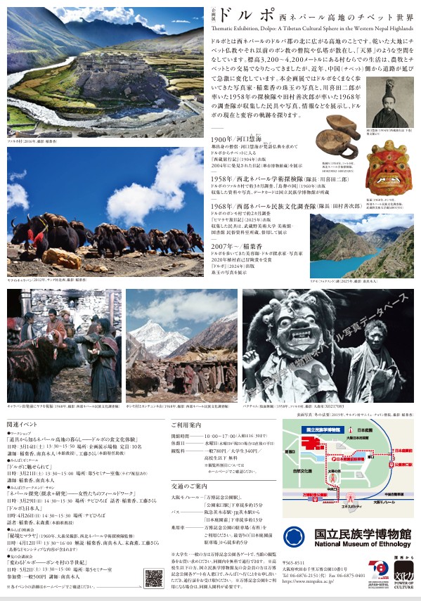 会場では 写真家 稲葉香による現地取材に基づく写真作品を中心に 国立民族学博物館 武蔵野美術大学 堺市博物館の所蔵資料を交えながら ドルポの人びとの日常 儀礼 信仰 そして近年の社会変化を可視化する。隔絶された高地において培われてきた世界観と 現代社会との接触による変容を静かに見つめることで 人間の暮らしと文化の持続性について考える契機を提示する展覧会である。