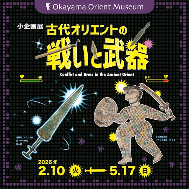 古代オリエント世界において 戦いは単なる軍事行為ではなく 王権 宗教 社会秩序と深く結びついた行為であった 本展では 岡山市立オリエント美術館が所蔵する武器や馬具などの資料を中心に 古代の人々がどのように戦争を認識し どのような装備を用いていたのかを紹介する 剣 槍 鏃 馬具といった実物資料を通して 戦場の技術的側面だけでなく 戦争が社会や信仰の中でどのような意味を持っていたのかを読み解く 小企画展ながら 古代オリエント文明の力と思想に迫る内容となっている