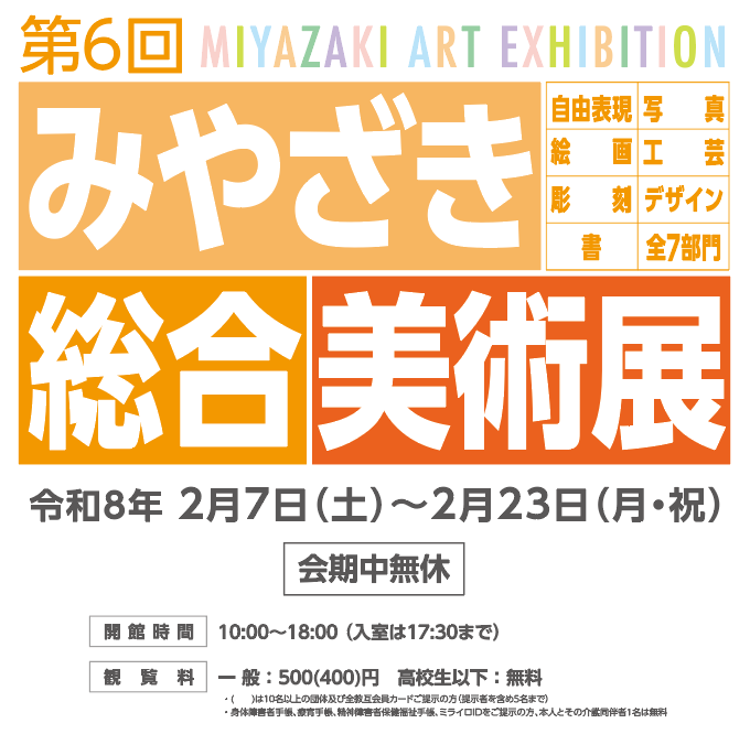 本展は 宮日総合美術展と宮崎県美術展の統合によって誕生した 宮崎県最大規模の公募美術展である 第6回となる今回は 創設当初から設けられている 自由表現 に加え 絵画 彫刻 書 写真 工芸 デザインの計7部門で構成される