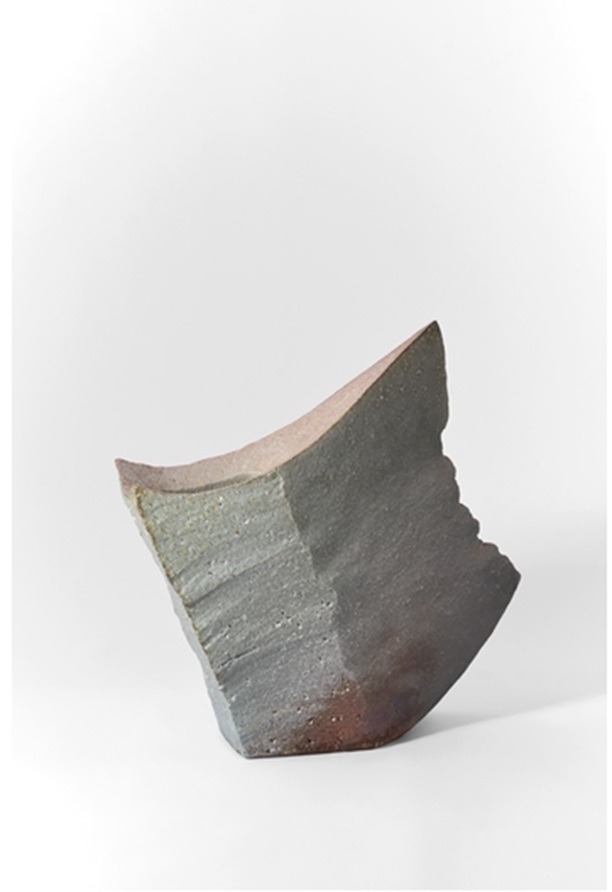 紐づくりによる成形と削りによって生まれるシャープなフォルムに、あえて小石を残した粗い土肌が重なり、土 火 風 水といった自然要素が作品内部で緊張関係を保つ。