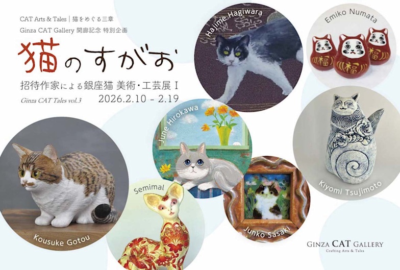 本展は Ginza CAT Galleryの開廊記念企画として開催される 招待作家によるグループ展である。木彫 陶磁 七宝 ガラス 絵画など 多様なジャンルで活動する作家たちが それぞれの視点と技法を通して 猫のすがおを表現する。かたち しぐさ まなざし 気配といった 日常の中にふと現れる猫の存在感をすくい取り 静かな愛しさとして作品に定着させている。本展は 2月から3月にかけて展開されるシリーズ企画 CAT Arts & Tales 猫をめぐる三章 の第一章として位置づけられ 銀座という都市空間に 猫をめぐる美術と工芸の新たな拠点を提示する。