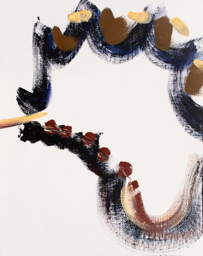 一見奔放に見える画面には、既存の様式や「上手さ」から意識的に距離を取り、「いま描くべきもの」を直接すくい上げようとする明確な制作姿勢が通底している。高度な集中状態のなかで、自己と世界が圧縮され再び分離する瞬間に生じる“圧着痕”の感覚を出発点とし、その揮発的な出来事を素早くなぞり取ることで作品が成立する。