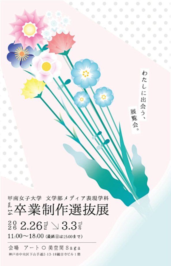 - 2月開催, 3月開催, アート〇美空間Saga, ゼミ選抜作品, デザイン展示, マンガ作品展, メディアアート, メディア表現学科, 三宮アート, 下山手通ギャラリー, 入場無料展, 兵庫県展覧会, 写真展示, 卒展2026, 卒業制作展, 大学展覧会, 大学芸術教育, 学生アートプロジェクト, 学生作品展, 文学部展示, 新世代クリエイター, 映像作品展, 甲南女子大学, 神戸ギャラリー巡り, 神戸三宮ギャラリー, 神戸文化イベント, 第14回卒業制作選抜展, 若手クリエイター, 表現の多様性, 関西アート