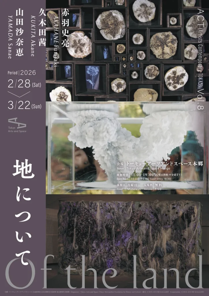 - 2月開催, 3月開催, ACT Vol.8, Artists Contemporary TOKAS, TOKAS, アーティストトーク, ギャラリー展示, サウンドパフォーマンス, トーキョーアーツアンドスペース本郷, 久木田茜, 人と地の関係, 企画展TOKAS, 土地の固有性, 地について, 地中世界, 山田沙奈恵, 文京区アート, 本郷ギャラリー, 東京アートシーン, 東京都現代美術館関連, 災害と映像, 無料展覧会, 現代アート東京, 現代美術展, 精神と自然, 自然との共鳴, 若手作家紹介, 装飾モチーフ, 赤羽史亮, 都市と土地