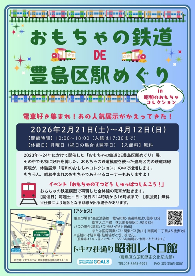概要:2023年から24年にかけて開催され好評を博した展示が体験企画として復活。おもちゃの鉄道模型で豊島区内の鉄道路線を再現し 土日祝日の14時頃から16時頃まで模型列車が実際に走行する。昭和生まれのおもちゃで遊べる体験コーナーも設けられ 子どもから大人まで楽しめる参加型展示となっている。鉄道模型を通して地域の路線や駅を身近に感じる機会を提供する。
