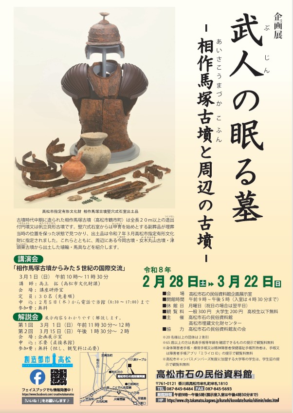 概要:古墳時代中期に築造された相作馬塚古墳の発掘成果を中心に その周辺古墳群とあわせて紹介する企画展。相作馬塚古墳は未盗掘で発見され 竪穴式石室から甲冑 大刀 ヤリ 鉄鏃などの武具 玉類 須恵器 土師器などが埋葬当時の状態を保って出土した。あわせて相作牛塚古墳 今岡古墳 女木丸山古墳 津頭東古墳など周辺遺跡の出土資料も展示し 古墳時代前期から後期にかけての地域首長層の実像に迫る。武人の墓に副葬された多様な考古資料を通して 当時の社会構造や軍事的性格 地域支配のあり方をわかりやすく解説し 地域文化財への理解を深めることを目的とする。