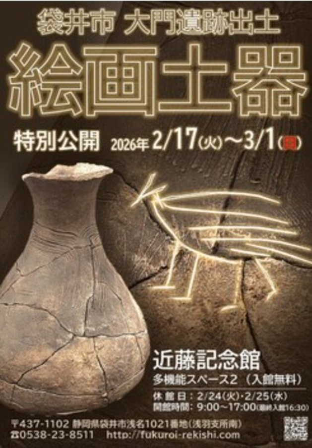 概要:JR袋井駅南側の高尾地内で実施された大門遺跡の発掘調査において、新たに弥生時代中期約2000年前の壺形土器が出土した。本資料は器面に4本脚の動物や建物を想起させる絵柄が描かれた「絵画土器」であり、器形がほぼ完形で残り、複数の図像が確認できる点で全国的にもきわめて貴重な事例である。本公開では期間限定で実物を展示し、弥生人の造形感覚や象徴表現、当時の生活や精神世界を考える機会を提供する。発掘成果を間近に体感できる貴重な機会である。