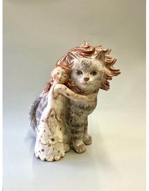1997年に埼玉大学大学院を修了し、現在は文化学園大学准教授として教育と制作の両輪で活動する加茂幸子。本展では代表作〈守護猫〉シリーズを中心に紹介する。高温焼き締めによって土の質感を生かし、釉薬や金泥を効果的に用いた立体作品は、静かな力強さと物語性を帯びる。「女性が乗ると獅子のように変化する猫」というコンセプトは、守護と変容、内なる力の覚醒を象徴するイメージであり、動物と人物が融合しながらメタモルフォーゼする造形は、夢の断片のようでもあり、どこか原初的な記憶を呼び覚ます。土という素材の持つ温もりと、神話的な想像力が交差する空間を体感できる展覧会である。