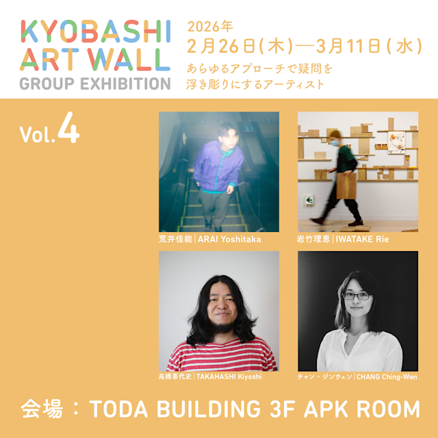 本展は、「KYOBASHI ART WALL―ここから未来をはじめよう」プログラムの最終章として開催されるグループ展である。同プログラムは、TODA BUILDING建設時の仮囲いを活用し、若手アーティストに創作発表の機会を提供してきた継続的なアートプロジェクトであり、ビル開業後は「ART POWER KYOBASHI」の取り組みとして新たな展開を迎えている。Vol.4では、荒井佳能、岩竹理恵、高橋喜代史、チャン・ジンウェンの4名を紹介。多様なアプローチを通じて社会や存在への問いを浮かび上がらせる表現が集う。それぞれ異なる活動背景を持ちながらも、現在という時間軸における思考と実践を提示する展示となる。空間は3階APK ROOM。都市再開発とアートの接点としての京橋において、建築と表現の関係性を再考する機会を提供する。