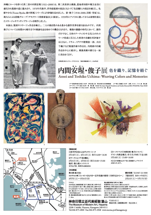 日系移民二世としてアメリカに生まれた内間安瑆は、1940年に来日し画家を志した。戦後は恩地孝四郎や棟方志功と交流し、創作版画の革新に取り組む。やがて「色面織り」と呼ばれる独自の木版技法を深化させ、代表作〈Forest Byobu〉連作へと到達した。本展では、その版画芸術の展開をたどるとともに、幻想的なアッサンブラージュ作品で知られる妻内間俊子にも光を当てる。さらにイサム・ノグチら関連作家の作品を交えながら、二人が紡いだ創作の軌跡と、記憶と色彩が交差する豊かな芸術世界を回顧する企画展である。