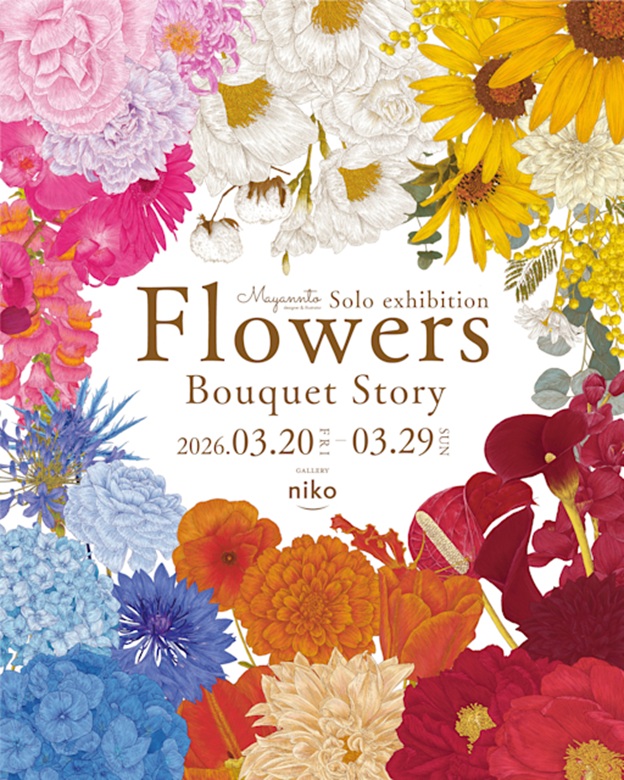 本展は、Designer & Illustratorとして活動するMayanntoによる個展である。iPadとタッチペンを用いたデジタル制作を基盤に、繊細な線描と生命力あふれる鮮やかな色彩によって花束を描き出す作家の最新作が展示される。テーマである「Bouquet story」は、花束に込められた想いと物語に焦点を当て、特定の中心作品を設けず、色彩や構成の異なる多様なブーケの連なりによって空間全体で世界観を構築する試みである。一本一本の線を丁寧に重ねることで花弁の質感を表現し、線の強弱や色の重なりを精緻に調整する制作プロセスは、デジタルでありながら手描きの感覚を大切にする姿勢を示す。さらに、画面上と印刷物との色差を埋めるための綿密な色調整を重ねることで、理想的な色彩表現を追求している。来場者は展示空間を巡りながら、それぞれの花束が語りかける物語に耳を澄まし、自身の心に響く唯一のブーケと出会う体験を得ることができる。