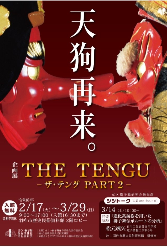 概要:能登半島地震からの復興の歩みの中で再開される獅子舞企画展。能登各地に伝わる獅子舞文化に欠かせない存在である天狗に焦点を当て 羽咋 氷見 志賀 宝達志水など地域ごとの天狗を比較展示する。能登型 氷見型など多様な造形や出で立ちを通して 地域文化の個性と連続性を浮かび上がらせる。会期中には進化系統樹を用いた獅子舞伝承ルートの分析講座や 天狗アバター体験も実施され 伝統とテクノロジーを横断する体験型展示として展開される。祭りと獅子舞が地域を再び結び直す力であることを提示する企画である。