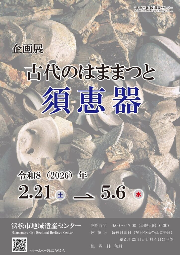 概要:古墳時代中期に朝鮮半島から伝来した灰色の土器 須恵器に焦点を当て 浜松市内で出土した資料を通して地域の古代史を紹介する企画展。須恵器の製作技術や器形の特徴 流通の広がりを示し 海を越えた技術交流と在地社会の受容の様相を読み解く。地域遺産の視点から 古代のはままつにおける文化形成の一端を明らかにする展示である。
