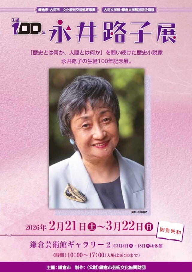 概要:歴史小説家で鎌倉市名誉市民の永井路子の生誕100年を記念する展覧会。敗戦体験を出発点に 炎環 北条政子 氷輪 など数多くの歴史小説を発表し 歴史とは何か 人間とは何かを問い続けた作家の軌跡をたどる。英雄史観にとらわれず とりわけ女性の役割に光を当て 鎌倉時代を中心に多様な時代像を描いた文学世界を紹介する。古河文学館および鎌倉文学館の資料を通して 創作の背景と生涯の歩みを多角的に伝える記念展である。