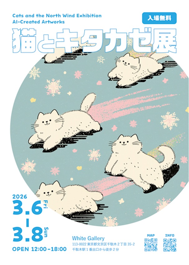 「猫」をテーマにしたAIアートの展示販売会。気まぐれでやさしく、ときに孤独な存在として描かれる猫をモチーフに、幻想性と物語性を重ねた一点物の作品を紹介する。かわいらしさだけにとどまらず、風の中に立つ猫や誰かを待つ猫など、それぞれが物語の入口となる作品群が並ぶ。展示作品は一部を除き購入可能で、売上の一部は保護猫団体へ寄付される。作品を迎える行為が現実の猫たちの未来へとつながる循環を生み出すことを目指し、アートを通して猫と人との関係を静かに見つめ直す企画である。
