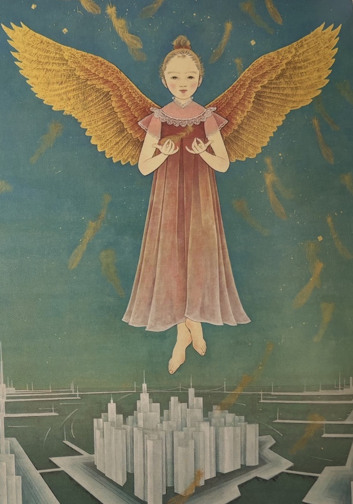 間瀬は童子の姿を通して「森羅万象」を描く。宇宙や自然界に存在するすべての生命と事象が相互に関係し合いながら世界を形づくるという思想を、澄んだ眼差しの童子に託す。花や動物を抱く神々しい姿は、鑑賞者自身の存在や行いを静かに問いかける。