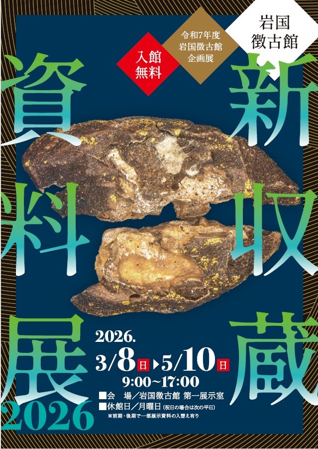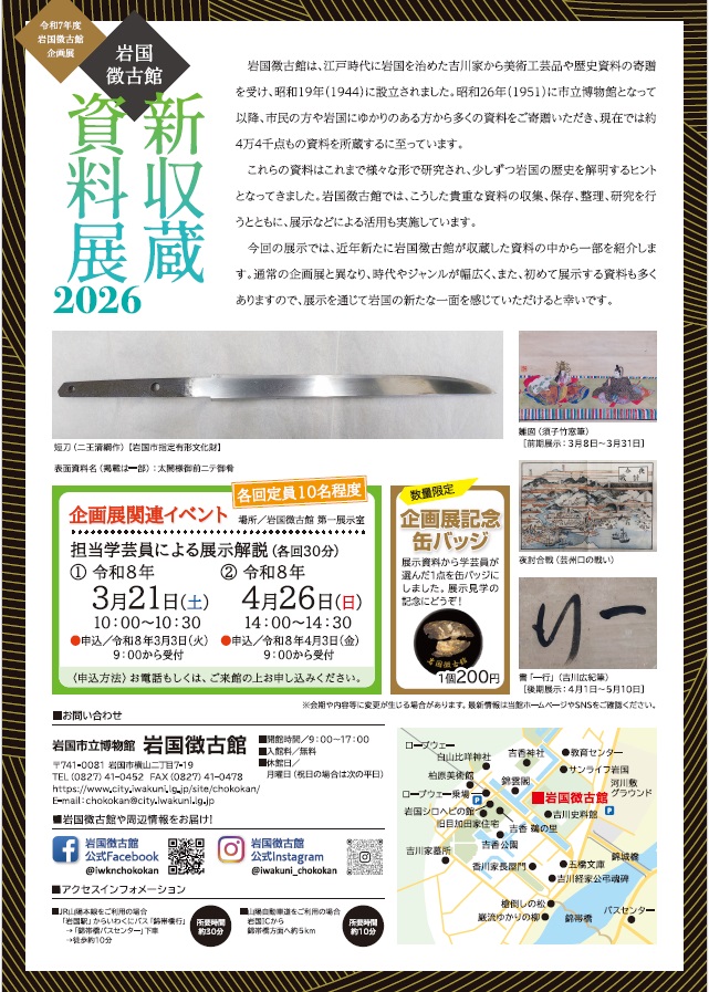 岩国徴古館が新たに収蔵した資料を紹介する企画展。歴史資料や文化資料など、近年収集された多様な資料を通して、地域の歴史や文化の広がりを紹介する。新収蔵資料展は、博物館活動の重要な柱である収集活動の成果を公開する機会であり、地域史研究の新たな手がかりを示す役割も担う。本展では、岩国地域の歴史や文化を伝える資料を中心に展示し、それぞれの資料が持つ背景や意義を通して、地域文化の継承と研究の広がりを紹介する。