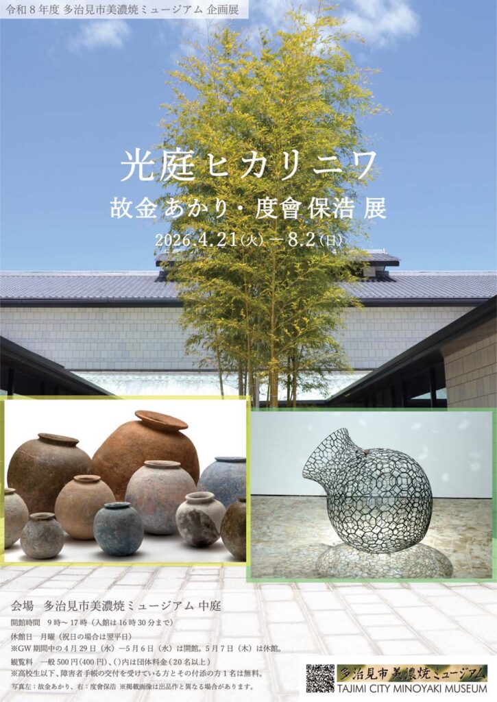本展は美濃焼ミュージアムの展示室を囲む中庭「光庭」を会場として開催される屋外展示の企画展である。建築空間に光と風を取り入れるために設けられた光庭を展示空間として活用し2015年以来11年ぶりとなる屋外展示が行われる。出品作家は美濃地域にゆかりを持つ陶芸家故金あかりとガラス作家度會保浩の二名である。故金あかりは色化粧土を用いた温かみのある器やカラフルで力強い大型壺作品を制作し空間全体を活かした展示を展開する。一方度會保浩は壺の形を用いたステンドグラス作品を制作し光を透過した色彩が床や壁に広がるインスタレーションを特徴としている。陶とガラスという異なる素材を用いながら共通する器の形態を基軸に春の光のなかで作品と空間が響き合う展示となる。