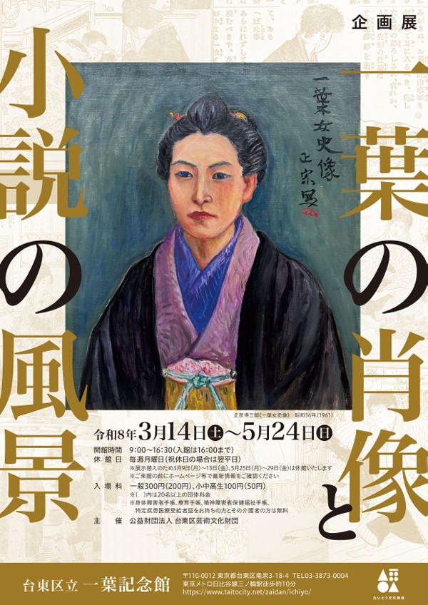 明治の女流作家として知られる樋口一葉の文学世界と、その作品から着想を得て描かれた絵画や挿絵資料を紹介する企画展。現在では文字のみで読まれることが多い一葉の小説だが、発表当時の雑誌掲載では多くの作品に挿絵が添えられており、読者は物語とともに視覚的なイメージを共有していた。本展では、小説の挿絵、絵画作品、画集、ゆかりの地を描いた錦絵などを展示し、一葉の物語世界を視覚的資料から読み解く。また鏑木清方や木村荘八ら画家たちが描いた肖像や作品世界を通して、一葉文学が近代日本の美術に与えた影響を紹介する。さらに写真や肉筆肖像画などの資料を通して、一葉という人物の実像にも迫り、文学と美術の交差点に広がる文化的背景を探る展覧会である。