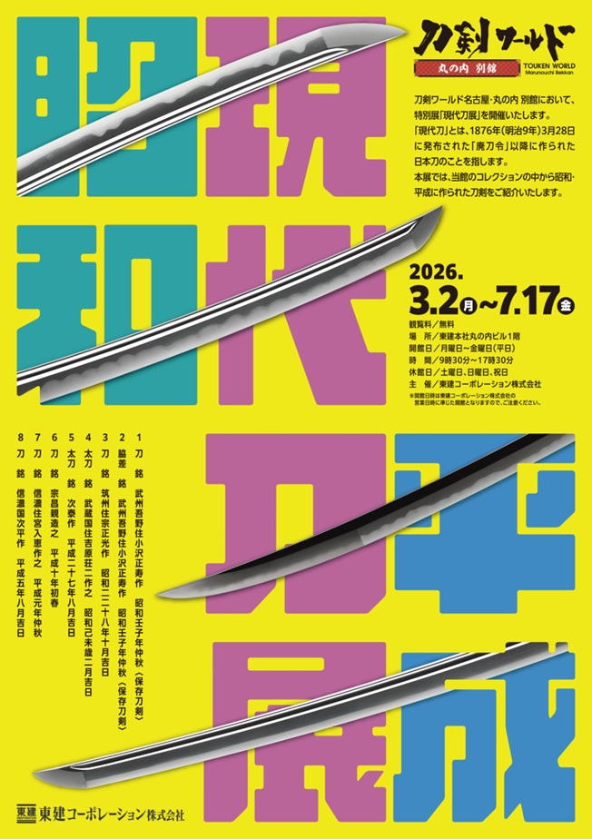 本展は、日本刀の伝統を受け継ぎながら現代に制作される刀剣を紹介する展覧会である。日本刀は古来より武器であると同時に、鍛冶技術・美術工芸・精神文化が融合した日本文化を象徴する工芸品として発展してきた。本展では現代刀匠によって制作された作品を中心に展示し、伝統的な鍛錬技法や美しい刃文、地鉄の表情など、日本刀の造形美と技術の継承を紹介する。刀匠たちが受け継いできた技術と精神を通して、現代に生きる日本刀の魅力と、日本の刀剣文化の奥深さを体感できる展覧会となっている。
