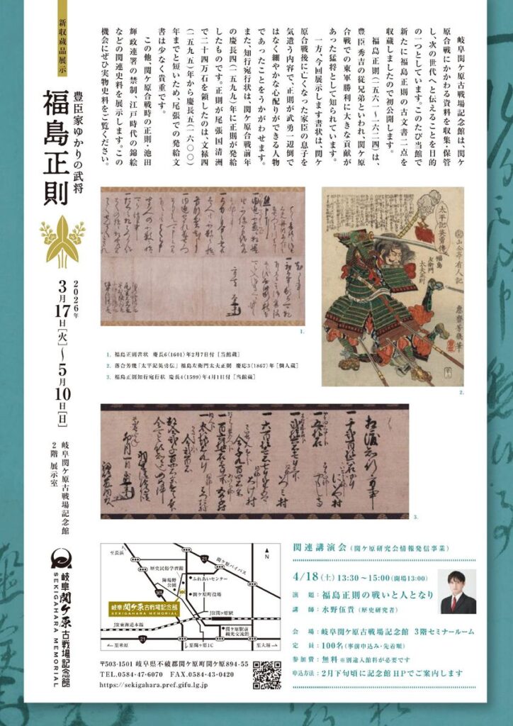 名称:新収蔵品展示「豊臣家ゆかりの武将 福島正則」岐阜関ケ原古戦場記念館