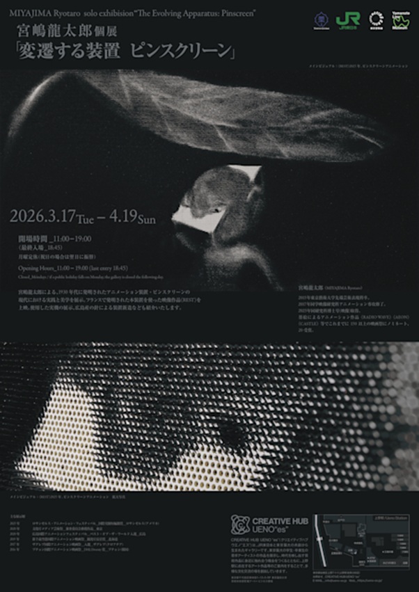 - CREATIVE HUB UENO es, アートイベント, アートテクノロジー, アートと技術, アートプロジェクト, アート展示, アニメーション史, アニメーション装置, ピンスクリーン, メディアアート, メディア芸術, メディア表現, 上野アートスペース, 光と影, 実験映像, 実験的アート, 宮嶋龍太郎, 日本現代アート, 映像インスタレーション, 映像作品, 映像文化, 映像芸術, 映像表現, 東京現代美術, 現代作家, 現代美術, 現代芸術展, 美術展示, 装置美学, 装置芸術