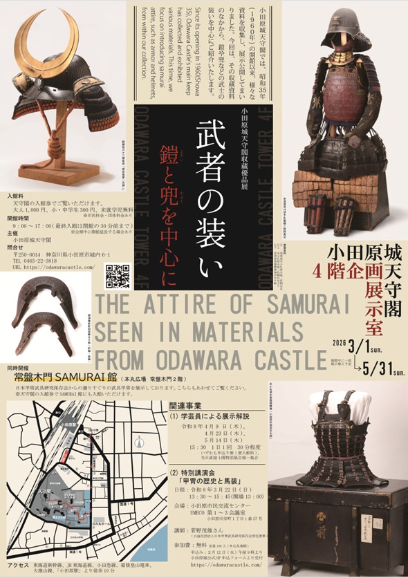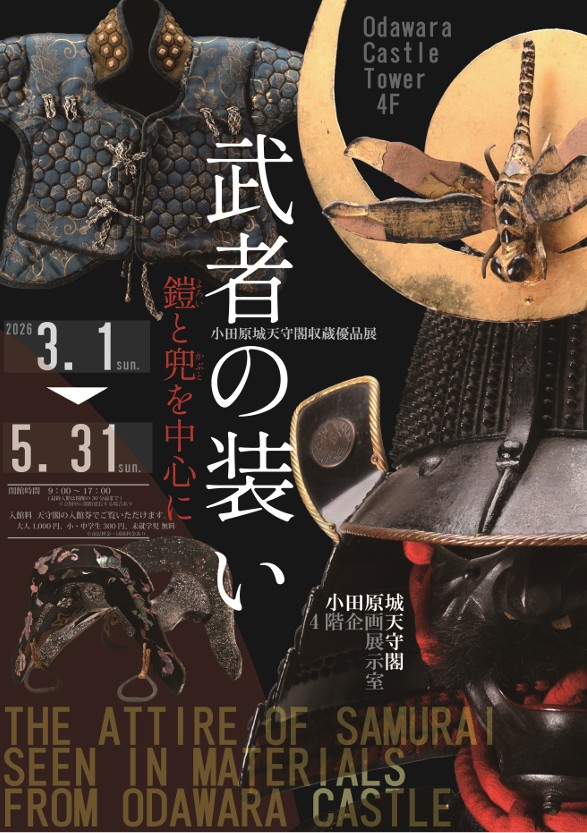 概要:本展は小田原城天守閣の収蔵資料の中から武者の装いをテーマに紹介する展覧会である。小田原城天守閣では1960年の開館以来、古文書や絵図、美術工芸品など約2500点に及ぶ資料を収集保存してきた。本展では通常展示では公開される機会の少ない資料も含め、鎧や兜など武士の装束に関する資料を中心に紹介する。武具や装飾に込められた武士文化の美意識や身分象徴としての意味を通して、戦国から近世にかけての武士の姿を読み解く展示となっている。