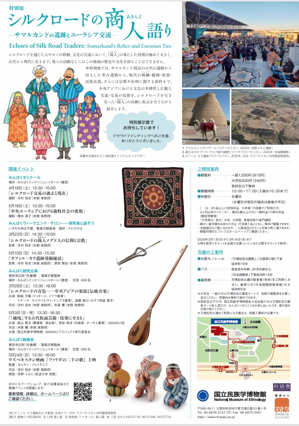 本展は ユーラシア大陸の文明交流を支えた存在として シルクロードの商人に焦点を当て 中央アジアと周辺世界を結んだ交易と文化交流の実像を明らかにする特別展である 東西 南北の文化が交錯する要衝であった中央アジアにおいて 商人は物資のみならず 技術 宗教 信仰 芸能 生活文化を媒介する役割を担ってきた 展示では ウズベキスタン共和国サマルカンド市周辺の古代遺跡から出土した考古遺物をはじめ 現代の刺繍 織物 楽器 民族衣装 宗教資料などを通じて 古代から現代に至る商人の活動を立体的に紹介し シルクロードを舞台とした広範な交流と文化の多様性を再考する