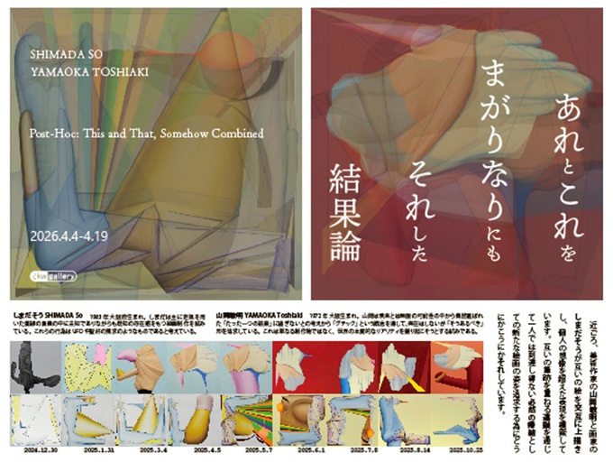 本展は美術作家・山岡敏明と画家・しまだそうによる二人展である。両作家は約1年間にわたり二枚のキャンバスを互いに交換しながら制作を行い、相手の絵の上に自らの筆跡を重ねる「往復書簡」のようなプロセスを通して作品を完成させた。一方が描いた意図をもう一方が読み取り、塗り重ねたり、あえて残したりしながら進められた制作は、対話と侵食を繰り返す共同制作の実験ともいえる。本展では、このプロセスを経て完成した最終的な絵画作品2点を中心に、関連するドローイングやペインティング作品を展示する。二人の作家の異なる表現が交差することで生まれた、予測不可能な視覚的調和と緊張関係を提示する展覧会である。