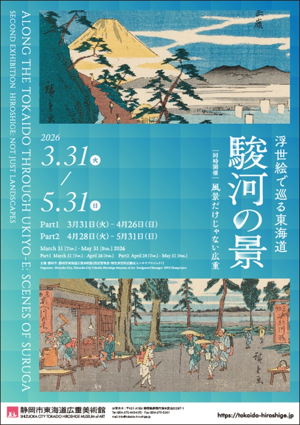 作品には、旅人や行商人、農民など当時を生きる人々の姿が描かれ、単なる風景画にとどまらず、街道文化や風俗の記録としての側面も持つ。富士山をはじめとする自然景観と人々の暮らしが一体となった情景は、江戸時代の旅の魅力と地域文化の豊かさを今に伝える。本展では、浮世絵を通して東海道・駿河の歴史と風景の魅力を体感できる構成となっている。