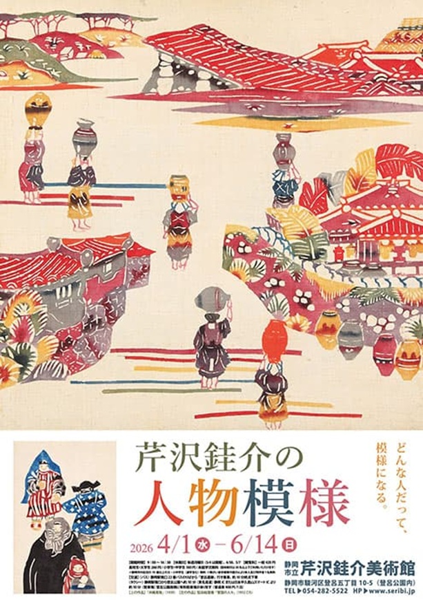 概要:本展は型染の巨匠芹沢銈介が生涯にわたり取り組んだ人物表現に焦点を当てる企画展である。40歳以降に顕著となる労働する人々や市場の群像など、生活に根ざした人物像から、戦後に展開される抽象的な人物表現まで、その変遷を約100点の作品で紹介する。「沖縄風物」や「童児文のれん」などの代表作に加え、絵本やカレンダー、日用品に及ぶ幅広い仕事を通して、民藝運動の理念と結びついた造形世界を提示する。さらに後半では、芹沢が収集した世界各地の仮面を展示し、造形への関心の広がりを示す。
